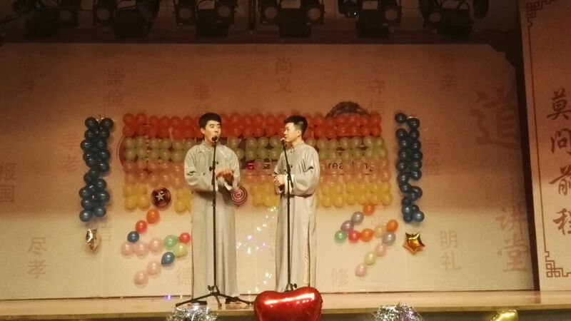 晚会节目非常精彩,可谓是花样百出。有优雅婉转的舞蹈表演、搞笑连连的小品相声、动人心弦的优美歌声等表演,期间还有丰富的趣味游戏。同学们在舞台上充分展现了他们的风采和个性,给观众们留下了深刻的印象。晚会以舞蹈《西班牙之火》开场,热情似火的舞蹈让同学们眼前一亮,接下来的歌曲《等你下课》、《浪费》、《你那么爱他》让现场充满了恋爱的味道。杯子舞、朗诵、小品将现场的气氛推向高潮,后面的相声,抖音舞蹈更是让台下的同学们呼声一波高过一波。