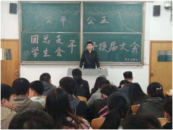 2018年11月21日下午,电力系团总支、学生会召开干部换届选举大会,参加此次会议的部门领导有:电力系党总支书记、电力系学生党支部书记、校团委书记、电力系学管办主任、电力系团总支书记、电力系学生会负责人、电力系辅导员老师及16级团总支、学生会干部和17级参与竞选的学生干事。